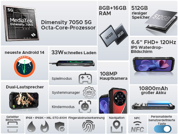- Dimensity 7050 5G Octa-Core-Prozessor: bietet rasante Leistung, reibungslosen Betrieb und keine Angst vor Verzögerungen. Eingebauter 24 GB Hochgeschwindigkeits-Arbeitsspeicher (8 GB + 16 GB), mit 512 GB Super-Speicherplatz, unterstützt bis zu 2 TB microSD-Kartenerweiterung, um den Bedarf an massiver Speicherung von Multimediadateien wie Musik, Filmen, Fotos usw. zu decken;