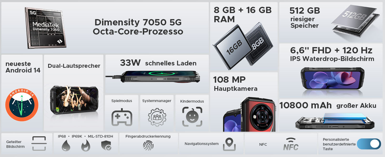 DOOGEE S118 Pro 5G Dimensity 7050 AI Dreifachkamera 24 GB RAM + 512 GB ROM / uMCP Handy